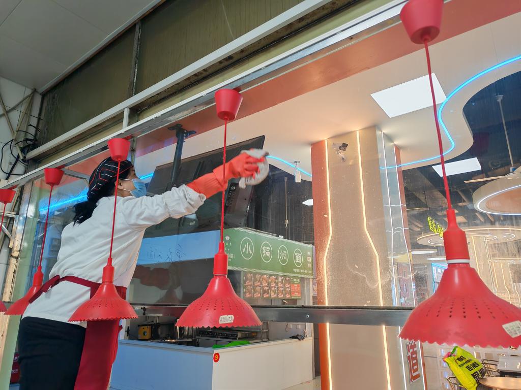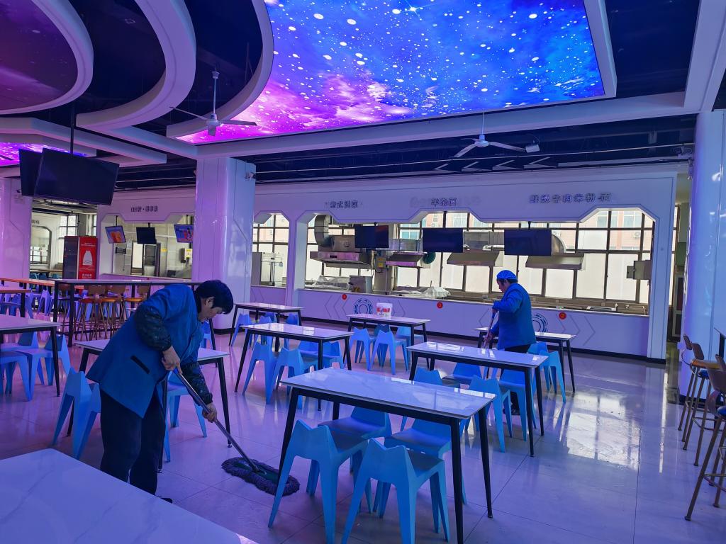 各餐厅工作人员对就餐大厅、操作间、库房、通道等区域进行全面清扫与消杀,重点清理卫生死角。对灶具、冷藏冷冻设备、通风排烟设备等进行检修与清洁,对餐具、厨具进行清洗消毒。着力落实食品安全相关要求,以整洁环境、优质服务迎接师生返校。